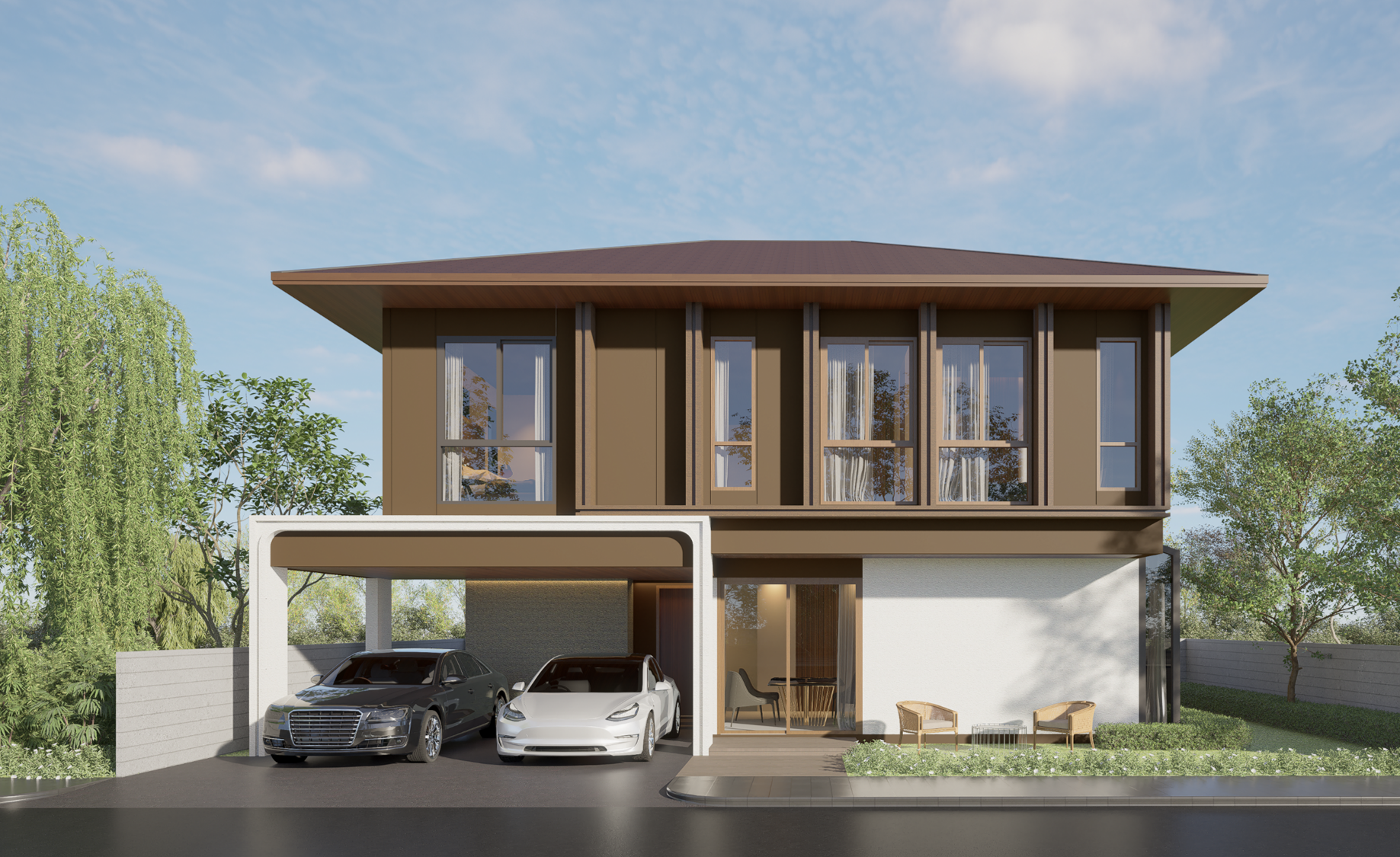 - แบบบ้านแฝด มีการจัดวางฟังก์ชันให้ครบครัน ทั้งห้องอเนกประสงค์ที่ชั้น 1, พื้นที่ครัวและโซน Laundry, ห้องน้ำภายในห้องนอนทุกห้อง รวมถึงการดีไซน์ Façade บ้านให้มีคาแรคเตอร์ที่แตกต่างกัน เพื่อสร้างไดนามิคที่ให้ความรู้สึกมีชีวิตชีวา และเพิ่ม Space พื้นที่รอบตัวบ้านเพื่อความเป็นส่วนตัวมากยิ่งขึ้น