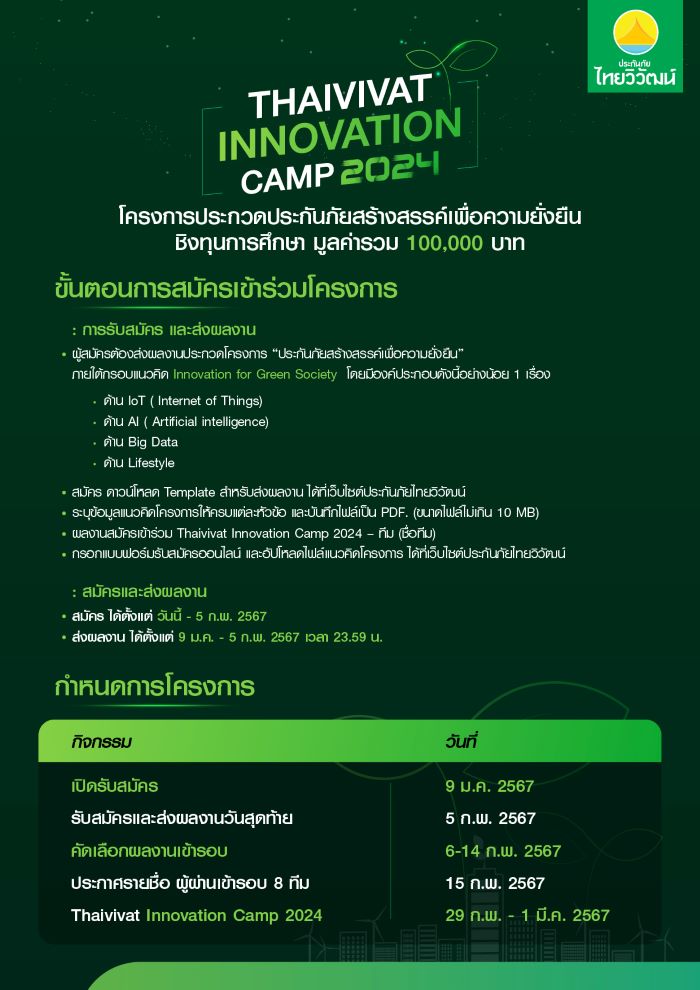 บริษัท ประกันภัยไทยวิวัฒน์ จำกัด (มหาชน) ผู้นำนวัตกรรมด้านการประกันภัยอันดับ 1 ของไทย ที่มุ่งพัฒนาผลิตภัณฑ์และบริการ เพื่อยกระดับคุณภาพชีวิตคนไทยอย่างต่อเนื่อง พร้อมส่งเสริมให้คนไทยมีหลักประกันที่มั่นคง ตามวิสัยทัศน์ “คิดเผื่อเพื่อทุกชีวิต” เดินหน้าพัฒนาสังคมสร้างศักยภาพด้านการศึกษาให้กับเด็กและเยาวชน พร้อมขับเคลื่อนการเติบโตและพัฒนานวัตกรรมด้านการประกันภัยอย่างเต็มรูปแบบหวังลดความเสี่ยงของสังคมไทยในอนาคต ประกาศจัดโครงการ “ประกวดประกันภัยสร้างสรรค์เพื่อความยั่งยืน Thaivivat Innovation Camp 2024 ” โดยมีเป้าหมายในการสร้างความตระหนักรู้ด้านการประกันภัยให้กับคนไทย รวมถึงมุ่งถ่ายทอดองค์ความรู้ และพัฒนาทักษะและกระบวนการคิดในการพัฒนานวัตกรรมให้กับเยาวชน อันจะสามารถเป็นกำลังสำคัญในการคิดต่อยอดเพื่อจัดการความเสี่ยงให้กับคนไทยในอนาคตอย่างยั่งยืน