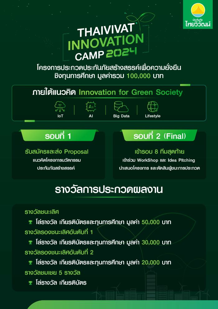 ทั้งนี้ โครงการฯ ดังกล่าว เปิดโอกาสให้เด็กและเยาวชน ที่กำลังศึกษาอยู่ระหว่างระดับชั้นมัธยมศึกษาตอนปลาย ระดับอาชีวศึกษา และระดับปริญญาตรีหรือเทียบเท่า สามารถส่งผลงานแนวคิดโครงการพัฒนานวัตกรรมด้านการประกันภัย ประเภททีม ทีมละไม่เกิน 4 คน ชิงทุนการศึกษามูลค่ารวม 100,000 บาท พร้อมโล่รางวัลและเกียรติบัตร ภายใต้โจทย์และแนวคิด Innovation for Green Society โดยมีองค์ประกอบของ loT, AI, Big Data หรือ Lifestyle ในการนำเสนอโครงการ โดยรูปแบบโครงการประกวดแบ่งออกเป็น 2 รอบ คือรอบแรกส่งผลงาน Proposal แนวคิดโครงการนวัตกรรมประกันภัยสร้างสรรค์เข้า และรอบที่ 2 คัดเลือกผลงาน 8 ทีมสุดท้าย เข้าร่วมกิจกรรม Thaivivat Innovation Camp และ Idea Pitching นำเสนอโครงการ เพื่อเปิดโอกาสให้เด็กและเยาวชนได้เรียนรู้ด้านการพัฒนานวัตกรรมด้านการประกันภัยจากประสบการณ์จริง จากผู้เชี่ยวชาญของบริษัทฯ ในรอบตัดสิน