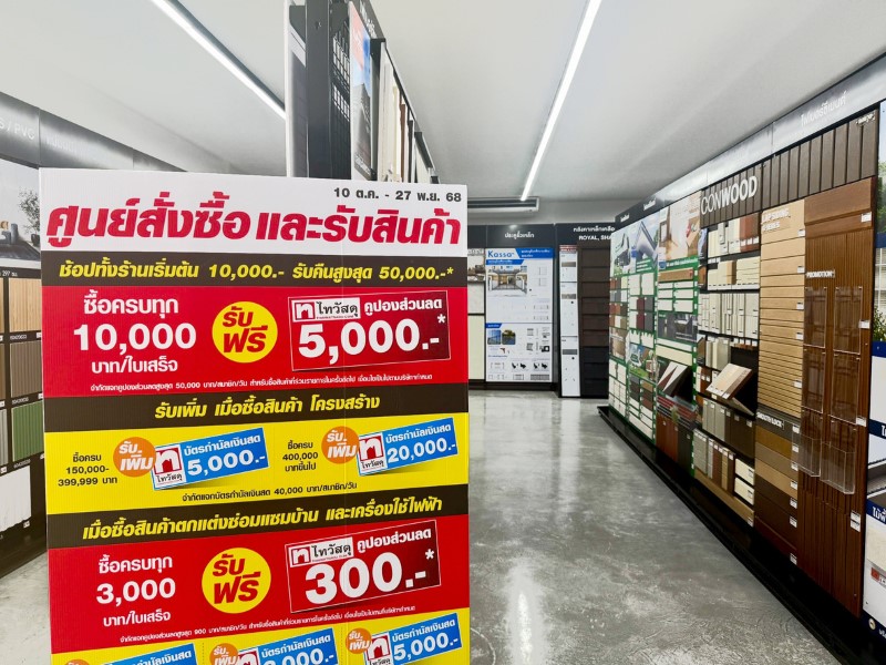 ·ช้อปสินค้ากลุ่มตกแต่ง ซ่อมแซมบ้าน และเครื่องใช้ไฟฟ้า 5,000 บาทขึ้นไป/ใบเสร็จ หรือช้อปสินค้ากลุ่ม โครงสร้าง 10,000 บาทขึ้นไป/ใบเสร็จ รับสิทธิ์ ส่งฟรี 60 กม. (ส่วนลดค่าขนส่งสูงสุด 900 บาท*)