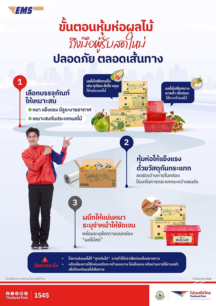 ดร.ดนันท์ กล่าวเสริมว่า นอกจากแพ็คเกจราคาที่ถูกออกแบบเฉพาะผู้ประกอบการแต่ละคน ไปรษณีย์ไทยยังได้สอดแทรกบริการเสริมเพื่ออำนวยความสะดวกให้แก่ภาคธุรกิจที่มีปริมาณพัสดุจำนวนมาก อาทิ บริการเข้ารับฝากสิ่งของถึงที่ (Pick-up Service) และบริการเก็บเงินปลายทาง (COD) พร้อมทั้งพัฒนาโซลูชันสำหรับกลุ่มสินค้าที่ต้องการการดูแลเป็นพิเศษ เช่น ผลไม้เปลือกบาง และสินค้ามูลค่าสูง ให้สามารถ ส่งด่วนของมีมูลค่าได้อย่างสบายใจในวงเงินการคุ้มครองสูงสุด 50,000 บาท อีกทั้งยังมีบริการคลังสินค้าครบวงจร “THP Fulfillment เก็บ แพ็ก ส่ง” เพื่ออำนวยความสะดวกแก่ผู้ประกอบการในการประหยัดเวลาจัดการรออเดอร์ ทีมงานผู้เชี่ยวชาญให้คำปรึกษาและคำแนะนำด้านการขนส่ง-โลจิสติกส์แก่ผู้ประกอบการ โดยร่วมกันหาโซลูชันการจัดส่งที่คุ้มค่าเพื่อให้ได้ประสิทธิภาพและความพึงพอใจสูงสุด