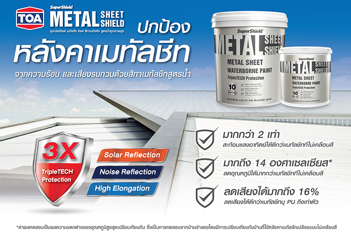สำหรับนวัตกรรมใหม่ สีทาหลังคาเมทัลชีท ‘ซุปเปอร์ชิลด์ เมทัลชีท ชิลด์’ (SuperShield Metal Sheet Shield) ที่ได้รับการพัฒนาขึ้นด้วยเทคโนโลยี 3X Triple Tech Protection พลังปกป้องเหนือระดับ เพื่อยกระดับมาตรฐานการปกป้องหลังคาโลหะให้ทนทาน เย็นสบาย และเงียบสงบกว่าที่เคย ด้วยคุณสมบัติเด่น 3 ประการ ไม่ว่าจะเป็น 1.Solar Reflection สะท้อนแสงอาทิตย์สูงสุด 96% สะท้อนได้ดีกว่าเมทัลชีทที่ไม่เคลือบสี มากกว่า 2 เท่า และยังสามารถลดอุณหภูมิที่พื้นผิวได้มากกว่าเมทัลชีทที่ไม่ได้เคลือบสีมากถึง 14 องศาเซลเซียส* 2.Noise Reduction ลดเสียงได้มากกว่าถึง 16% เมื่อเทียบกับเมทัลชีทเปลือย และสามารถช่วยลดเสียงได้มากกว่าเมทัลชีทที่บุด้วยพียูโฟมถึงเท่าตัว* 3.High Elongation เนื้อฟิล์มหนา ยืดหยุ่นมากกว่าสีน้ำทั่วไป ช่วยปกป้องและยืดอายุหลังคา