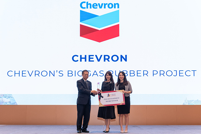 รางวัล “Thai Development Award” เป็นหนึ่งในสามรางวัลพิเศษที่มอบให้แก่องค์กรที่จัดทำโครงการที่สร้างผลกระทบเชิงบวกต่อสังคม ซึ่งเชฟรอนได้รับรางวัลนี้ จากโครงการ “ก๊าซชีวภาพสหกรณ์ยางพาราสู่สังคมคาร์บอนต่ำ” ที่เป็นความร่วมมือกับสถาบันวิจัยระบบพลังงาน (PERIN) มหาวิทยาลัยสงขลานครินทร์ ในการมอบความรู้ให้กับชุมชน นำระบบก๊าซชีวภาพ ระบบพลังงานแสงอาทิตย์ และโมเดล Zero Waste มาใช้ในกระบวนการรมควันยางแผ่น เพื่อเปลี่ยนน้ำเสียเป็นก๊าซชีวภาพและนำมารมควันจนได้ ‘ยางแผ่นรมควันคาร์บอนต่ำ’ เป็นผลสำเร็จ และสามารถแก้ปัญหาสิ่งแวดล้อม เช่น กลิ่นเหม็นและน้ำเสียจากการผลิตยางรมควันแบบดั้งเดิมของกลุ่มเกษตรกรชาวสวนยาง
