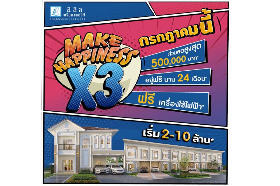 บริษัท ลลิล พร็อพเพอร์ตี้ จำกัด (มหาชน) หรือ (LALIN) จัดโปรโมชั่น ‘Make Happiness X3’ รวม 3 ความสุขพิเศษสุดมามอบให้พร้อมบ้านคุณภาพหลากหลายทำเล ทั้งบ้านเดี่ยว ทาวน์โฮม ประกอบด้วย แลนซีโอ, ไลโอ, บ้านลลิล, ลลิล กรีนวิลล์ ในราคา 2-10 ล้านบาท* โอกาสพิเศษ เพียงแค่ 2 วันเท่านั้น  3-4 กรกฎาคม 2564 กับความสุขแบบครบๆ ทั้งส่วนลดสูงสุด 500,000 บาท* พร้อมให้อยู่ฟรีนานถึง 24 เดือน* ตบท้ายด้วย ฟรี! กองทัพเครื่องใช้ไฟฟ้าแบบครบครัน (เงื่อนไขเป็นไปตามที่บริษัทฯ กำหนด) ได้รับเมื่อจองภายใน 3 ก.ค. 64 – 4 ก.ค. 64 และโอนกรรมสิทธิ์ภายใน 31 ก.ค.64 โดยสามารถลงทะเบียนรับสิทธิ์ได้ที่