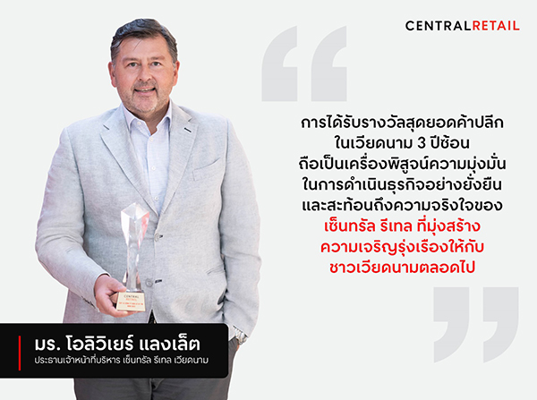 “ไม่เพียงแค่การขยายธุรกิจ แต่เซ็นทรัล รีเทล ยังเสริมสร้างความแข็งแกร่งให้กับชุมชน และยกระดับคุณภาพชีวิตของประชาชนชาวเวียดนามมาอย่างต่อเนื่อง ผ่านกิจกรรมเพื่อสังคมต่างๆ ทั้งในด้านการศึกษา สังคม และสิ่งแวดล้อม การได้รับรางวัลสุดยอดค้าปลีกในเวียดนาม 3 ปีซ้อน จึงถือเป็นเครื่องพิสูจน์ความมุ่งมั่นในการดำเนินธุรกิจอย่างยั่งยืน และสะท้อนถึงความจริงใจของเราที่มุ่งสร้างความเจริญรุ่งเรืองให้กับประเทศเวียดนาม และในนามของเซ็นทรัล รีเทล ผมต้องขอขอบคุณผู้บริโภคและคู่ค้าในเวียดนามทุกท่านที่สนับสนุน ไว้วางใจ และเชื่อมั่นในเซ็นทรัล รีเทล มาโดยตลอด เราจะยังคงเดินหน้าพัฒนาสินค้าและบริการของเรา เพื่อส่งมอบประสบการณ์ที่ดีที่สุดให้กับผู้บริโภค และทำให้ทุกภาคส่วนเติบโตอย่างยั่งยืนไปพร้อมกับเซ็นทรัล รีเทล” มร. โอลิวิเยร์ กล่าวปิดท้าย
