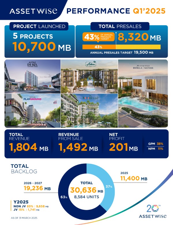 ASW กางผลประกอบการ Q1/2568 ยอดโอนโครงการแนวราบ-คอนโดหนุนรายได้รวม 1,804 ล้านบาท และกำไรสุทธิ 201 ล้านบาท พร้อมฐานมั่นคงหลังกวาดยอดพรีเซล 8,320 ล้านบาท ทะลุ 43% ของเป้ายอดขายทั้งปี โชว์แบ็กล็อก 30,636 ล้านบาท พร้อมทยอยโอนรับรู้รายได้ต่อเนื่อง คาดตลาดอสังหาฯยังท้าทาย แม้มีแรงหนุนจากมาตรการรัฐ เฝ้าระวังผลกระทบนโยบายขึ้นภาษีนำเข้าสหรัฐและสงครามการค้า มุ่งรักษากระแสเงินสด-ส่งมอบงานตามกำหนด Q2/2568 เตรียมโอนคอนโด Low-Rise สร้างเสร็จใหม่เพิ่ม 2 โครงการ และเตรียมส่ง THE TITLE Legendary Bang-Tao หนุนรายได้หลักครึ่งปีหลัง ย้ำตั้งการ์ดพร้อมปรับกลยุทธ์รับทุกสถานการณ์ มั่นใจรายได้และยอดขายได้ตามเป้า