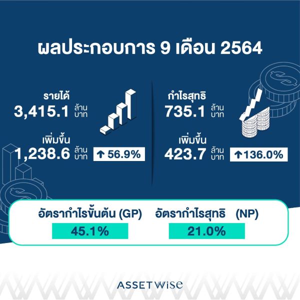 นายกรมเชษฐ์ วิพันธ์พงษ์ ประธานเจ้าหน้าที่บริหาร บริษัท แอสเซทไวส์ จำกัด (มหาชน) (ASW) เปิดเผยว่า ภาพรวมผลการดำเนินงานในงวดไตรมาส3/2564 มีกำไรสุทธิอยู่ที่ 156.8 ล้านบาท เพิ่มขึ้น 73.4% จากงวดเดียวกันปีก่อนที่มีกำไรสุทธิเท่ากับ 90.5 ล้านบาท ขณะที่รายได้รวมอยู่ที่ 1,134.2 ล้านบาท เพิ่มขึ้น 68.2% จากงวดเดียวกันปีก่อนที่มีรายได้รวมเท่ากับ 674.4 ล้านบาท