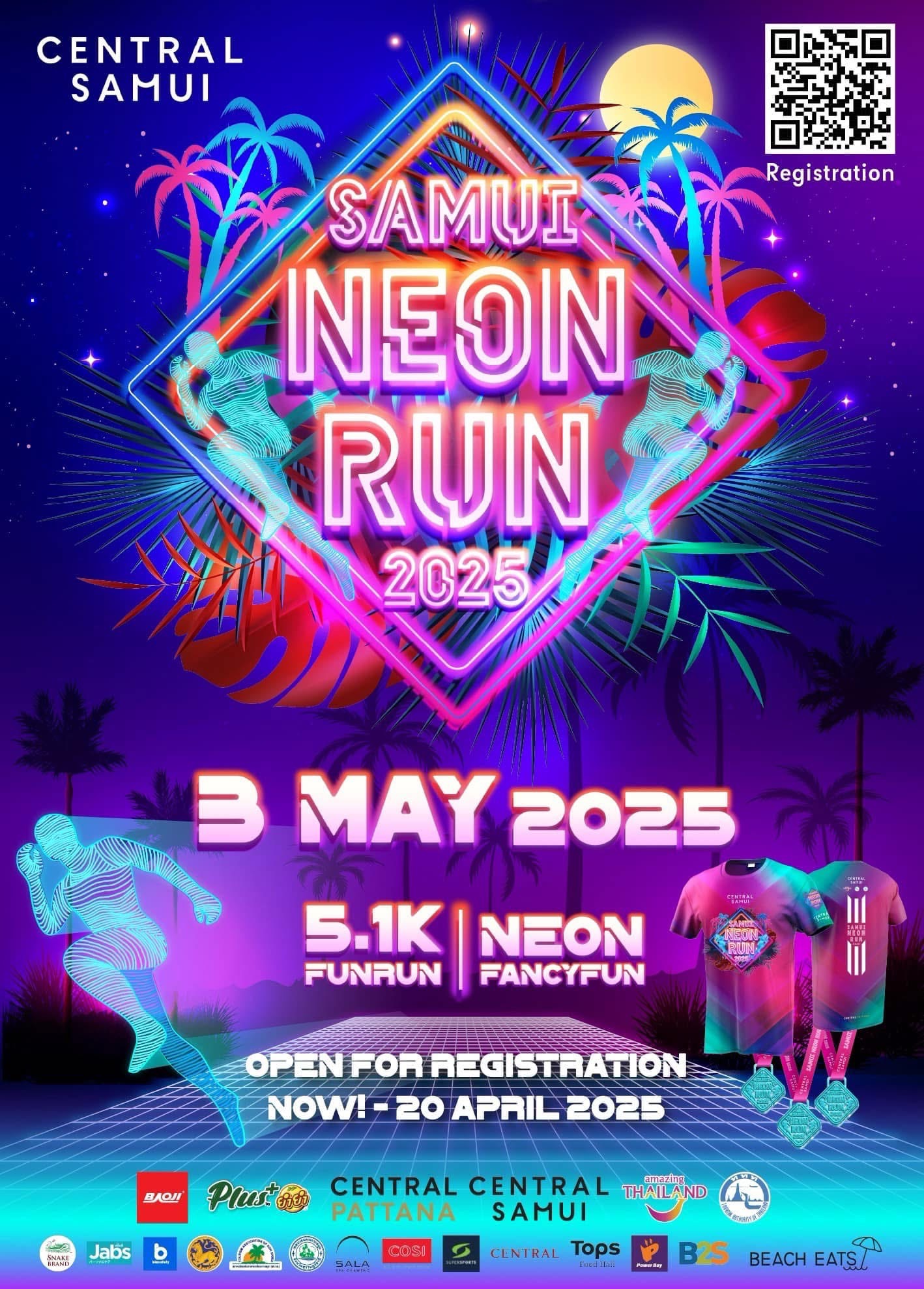 สมัครร่วมงาน Central Samui Neon Run 2025 ได้ตั้งแต่วันนี้ – 30 เมษายน 2568 ค่าสมัครท่านละ 550 บาท หรือ 15 ดอลลาร์สหรัฐ คลิก https://race.thai.run/samuineonrun2025 ฟิตร่างกายให้พร้อม แล้วมาวิ่งพร้อมกันในวันเสาร์ที่ 3 พฤษภาคม 2568 กิจกรรมเริ่มเวลา 13.00 น. ปล่อยตัวนักวิ่ง 19.00 น. ณ ศูนย์การค้าเซ็นทรัล สมุย