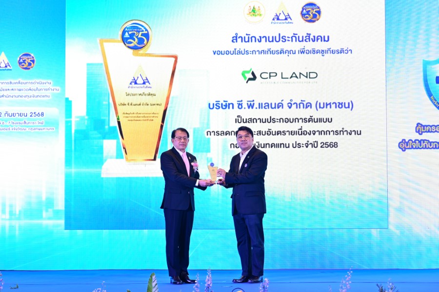 บริษัท ซี.พี.แลนด์ จำกัด (มหาชน) หรือ CP LAND ผู้นำด้านการพัฒนาอสังหาริมทรัพย์ของไทย ได้รับมอบ โล่ประกาศเกียรติคุณ สถานประกอบการต้นแบบการลดการประสบอันตรายจากการทำงาน จากสำนักงานกองทุนเงินทดแทน กระทรวงแรงงาน โดยมี คุณจักรพันธ์ ปิยะพฤกษพรรณ ผู้อำนวยการบริหาร กลุ่มงานบริการองค์กรและบริหารทรัพย์สิน CP LAND เป็นผู้แทนเข้ารับมอบรางวัลจาก คุณสุรสิทธิ์ นิธิวุฒิวรรักษ์ เลขานุการรัฐมนตรีว่าการกระทรวงแรงงาน ผู้แทนของ คุณพงศ์กวิน จึงรุ่งเรืองกิจ รัฐมนตรีว่าการกระทรวงแรงงาน