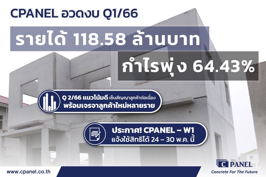 นายชาคริต ทีปกรสุขเกษม กรรมการผู้จัดการ บริษัท ซีแพนเนล จำกัด (มหาชน) (CPANEL) เปิดเผยถึง ผลประกอบการไตรมาส 1 ปี 2566 ว่าบริษัทมีรายได้รวม 118.58 ล้านบาท เพิ่มขึ้นจากช่วงเดียวกันปีก่อนที่มีรายได้รวม 90.30 ล้านบาท จำนวน 28.28 ล้านบาท หรือเพิ่มขึ้น 31.32% และมีกำไรสุทธิ 19.09 ล้านบาท เพิ่มขึ้นจากช่วงเดียวกันปีก่อนที่มีกำไรสุทธิ 11.61 ล้านบาท จำนวน 7.48 ล้านบาท หรือเพิ่มขึ้น 64.43%