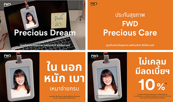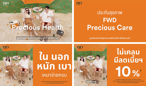 และสื่อบีทีเอส ตั้งแต่วันนี้เป็นต้นไป และผู้ที่สนใจผลิตภัณฑ์ FWD Precious Care สามารถติดต่อหรือสอบถามข้อมูลเพิ่มเติม ผ่านช่องทาง FWD Contact Center 1351 หรือผ่านทางเว็บไซต์ https://www.fwd.co.th