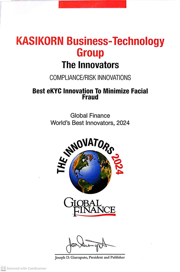 ล่าสุด เทคโนโลยี KBTG Face Liveness Detection สามารถคว้ารางวัล นวัตกรรมการเงินยอดเยี่ยม The Innovators 2024 ในสาขา Compliance/Risk Innovation: Best eKYC Innovation to Minimize Facial Fraud จากนิตยสาร Global Finance สื่อการเงินระดับโลก นับเป็นองค์กรไทยแห่งเดียวที่ได้รับรางวัลดังกล่าว ตอกย้ำผลงานนวัตกรรมของ KBTG  ที่พัฒนาด้วยความทุ่มเทใส่ใจในการปกป้องข้อมูลและสินทรัพย์เพื่อเพิ่มความไว้วางใจให้แก่ลูกค้า และได้รับการยอมรับในระดับสากล ทั้งนี้ KBTG Face Liveness Detection ได้ถูกนำไปใช้งานในแอปพลิเคชันต่าง ๆ ของธนาคารกสิกรไทยและบริษัทในกลุ่มธุรกิจธนาคารกสิกรไทย รวมทั้ง KBTG ไม่ว่าจะเป็น K PLUS ทั้งไทยและเวียดนาม แอป MAKE by KBank  แอป Kubix และอื่น ๆ รองรับลูกค้ารวมกว่า 20 ล้านรายทั่วภูมิภาคเอเซียตะวันออกเฉียงใต้  รวมทั้งการพัฒนาเป็นโซลูชัน AI สำหรับภาคธุรกิจที่ต้องการเพิ่มสะดวกและความปลอดภัยในระบบบริการ