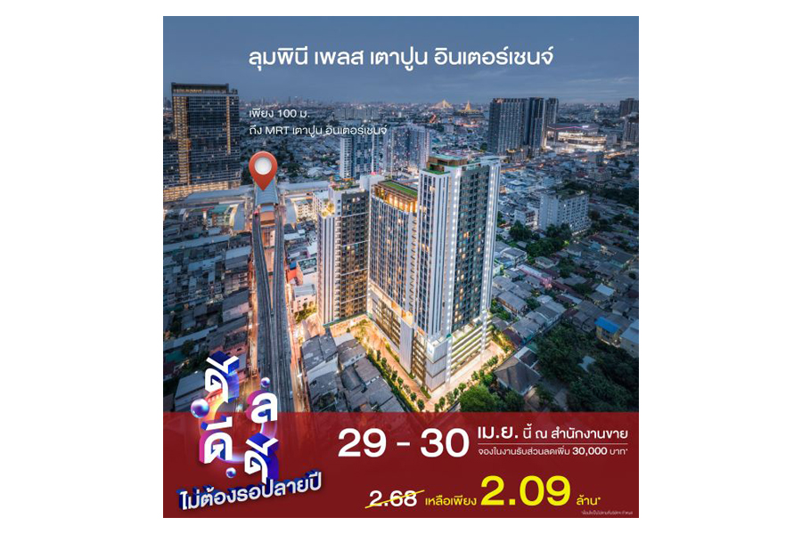 บริษัท แอล.พี.เอ็น.ดีเวลลอปเมนท์ จำกัด (มหาชน) จัดโปรโมชันพิเศษสุดฮอตแบบไม่เกรงใจหน้าร้อน ‘ดีลดีดี ไม่ต้องรอปลายปี’ โครงการ ลุมพินี เพลส เตาปูน อินเตอร์เชนจ์ คอนโดมิเนียมใหม่ พร้อมอยู่ ติดรถไฟฟ้า MRT สถานีเตาปูน เพียง 100 เมตร เชื่อมต่อทุกไลฟ์สไตล์การใช้ชีวิต รายล้อมด้วยสิ่งอำนวยความสะดวกอย่างครบครัน พร้อมผ่อนคลายในบรรยากาศธรรมชาติกับส่วนกลางขนาดใหญ่ และ facilities ที่ตอบโจทย์ทุกความต้องการของผู้อยู่อาศัยอย่างแท้จริง อาทิ Elevated pavilion ,Sky garden, Relaxing pool, Sky fitness, Co-working space และ Co-living area เป็นต้น ยกขบวน 10 ยูนิตคัดพิเศษ ชั้นสูง วิวสวย ทิศตะวันออก ในราคาเริ่มต้น 2.09 ล้านบาท รับส่วนลดเพิ่ม 30,000 บาท* ฟรี! เครื่องปรับอากาศ, Digital door lock และฟรีค่าใช้จ่ายวันโอน รับสิทธิ์ลุ้นรับเครื่องใช้ไฟฟ้าเพิ่มเติม เมื่อจองภายในงาน 29-30 เมษายนนี้เท่านั้น! ณ สำนักงานขาย โครงการ ลุมพินี เพลส เตาปูน อินเตอร์เชนจ์