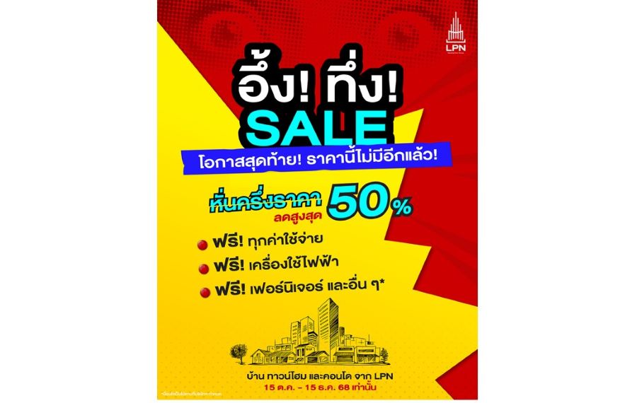 บริษัท แอล.พี.เอ็น.ดีเวลลอปเมนท์ จำกัด (มหาชน) หรือ LPN ผู้พัฒนาที่พักอาศัยคุณภาพมากว่า 36 ปี ด้วยความเชื่อมั่นจากประสบการณ์การดูแลลูกค้ากว่า 130,000 ครอบครัว ที่พร้อมยกระดับ “ความน่าอยู่” ทุกไลฟ์สไตล์การอยู่อาศัย เดินหน้าปล่อยแคมเปญใหม่ดันยอดไตรมาสสุดท้าย ‘อึ้ง ทึ่ง SALE’ พบกับโครงการบ้าน ทาวน์โฮม และคอนโดพร้อมอยู่คุณภาพทั้งในกรุงเทพและต่างจังหวัด รวมกว่า 28 โครงการ จุใจด้วยส่วนลดหั่นครึ่งราคา 50% สูงสุดกว่า 7 ล้านบาท* แบบราคานี้ไม่มีอีกแล้ว! และคุ้ม! ด้วยข้อเสนอ ฟรีเฟอร์นิเจอร์ ฟรีเครื่องใช้ไฟฟ้า และฟรีค่าใช้จ่ายวันโอน ฯลฯ ตั้งแต่วันนี้ – 15 ธ.ค. 2568 (เงื่อนไขเป็นไปตามที่บริษัทฯกำหนด) สำหรับ 28 โครงการที่เข้าแคมเปญ ‘อึ่ง ทึ่ง SALE’ ได้แก่