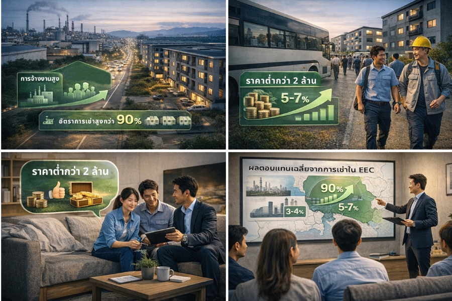 เมื่อเปรียบเทียบกับกรุงเทพฯ ซึ่งความต้องการที่อยู่อาศัยมักเชื่อมโยงกับไลฟ์สไตล์เมืองใหญ่ ไม่ว่าจะเป็นทำเลใกล้ระบบขนส่งมวลชน แหล่งค้าปลีก หรือย่านธุรกิจในพื้นที่ EEC กลับมีปัจจัยขับเคลื่อนที่แตกต่างอย่างชัดเจน ตลาดที่อยู่อาศัยในพื้นที่นี้ผูกโยงโดยตรงกับโครงสร้างอุตสาหกรรมและกิจกรรมการจ้างงานจริง ข้อมูลตลาดอสังหาริมทรัพย์ระบุว่า ปัจจุบันพื้นที่ EEC มีโครงการอาคารชุดรวมมากกว่า 15,000 หน่วย และในบางทำเลมีอัตราการเช่าสูงกว่า 90% ขณะที่ผลตอบแทนจากการปล่อยเช่าเฉลี่ยอยู่ในช่วงประมาณ 5 – 7% ต่อปี ซึ่งถือว่าอยู่ในระดับที่น่าสนใจสำหรับการลงทุนในระยะกลางถึงระยะยาว โดยช่วงราคาที่ได้รับความสนใจมากที่สุดคือระดับต่ำกว่า 2 ล้านบาท สะท้อนความต้องการของแรงงานและพนักงานระดับปฏิบัติการไปจนถึงระดับหัวหน้างานที่ต้องการที่อยู่อาศัยใกล้สถานที่ทำงานในราคาที่ไม่สร้างภาระเกินความจำเป็น แตกต่างจากบางพื้นที่เมืองท่องเที่ยวหรือเมืองเศรษฐกิจที่มีความเสี่ยงด้านอุปทานล้นตลาด ความต้องการใน EEC ยังอาศัยฐานการจ้างงานที่เติบโตสอดคล้องกับการลงทุนในนิคมอุตสาหกรรม ทำให้ดีมานด์มีความเชื่อมโยงกับเศรษฐกิจจริงมากกว่าการเก็งกำไรระยะสั้น