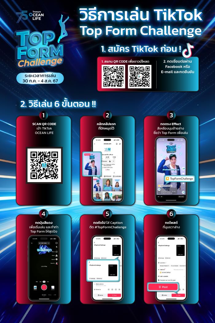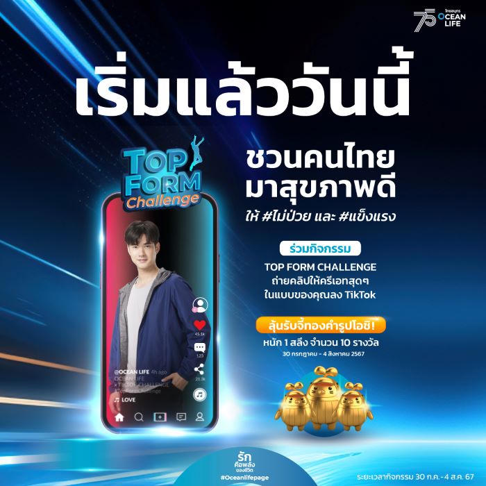 บมจ.ไทยสมุทรประกันชีวิต รักคือพลังของชีวิต โดยคุณนุสรา (อัสสกุล) บัญญัติปิยพจน์ ประธานเจ้าหน้าบริหารและกรรมการผู้จัดการ (CE0) เผยว่า เนื่องในวาระครบรอบ 75 ปี ของ OCEAN LIFE ไทยสมุทร มุ่งเน้นกลยุทธ์ “HEALTHIVERSE” สนับสนุนการสร้างโลกใหม่เพื่อชีวิตและสุขภาพที่ดีของคนไทย พร้อมแนวคิด “ประกันชีวิตและสุขภาพที่ช่วยให้คนไทยไม่ป่วย” เพื่อให้แนวคิดนี้เกิดขึ้นจริง จึงได้จับมือกับแพลตฟอร์มดัง อย่าง TikTok กับแคมเปญ “OCEAN LIFE Top Form Challenge” ชวนคนไทยทุกคน ไม่จำกัดอายุ เพศ วัย ทุกเจนเนอเรชั่น มาช่วยกันสร้างสรรค์ความรักสุขภาพในแบบของคุณ ให้มีชีวิตที่ Top Form ด้วยการถ่ายคลิปลง TikTok และใส่ #TopformChallenge เพียงเท่านี้ก็มีสิทธิ์ลุ้นรับ “จี้ทองคำโอชิ” น้ำหนัก 1 สลึง จำนวน 10 รางวัล มูลค่ารวมกว่า 1 แสนบาท ตั้งแต่วันที่ 30 กรกฎาคม – 4 สิงหาคม 2567 ดูรายละเอียดเพิ่มเติมได้ที่ https://www.ocean.co.th/tiktokchallenge-conditions