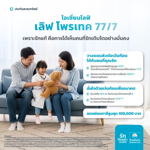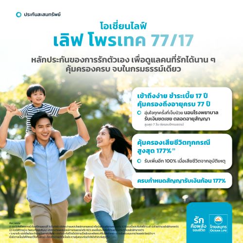 77 ปี OCEAN LIFE ไทยสมุทร ใช้ความรักเป็นพลังขับเคลื่อนองค์กร โดยไม่หยุดพัฒนาในทุกมิติ เพื่อทำให้ประกันชีวิตเป็นเรื่องง่าย ทำให้คนไทยเข้าถึงประโยชน์ของการประกันชีวิตได้มากที่สุด พร้อมแล้วที่จะเป็นส่วนหนึ่งในการดูแลโลกและสังคม เพื่อส่งมอบอนาคตที่ยั่งยืนให้กับคนรุ่นต่อไปได้ ใช้ชีวิตอย่างมั่นคง มั่นใจ ปลอดภัย มีความสุข สนใจติดตามรายละเอียดเพิ่มเติมได้ที่ www.ocean.co.th หรือ ติดต่อ OCEAN LIFE CONTACT CENTER 1503
