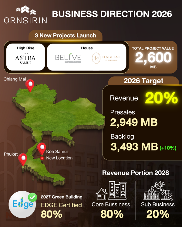 ORN กางแผนธุรกิจปี 2569 เปิด 3 โครงการใหม่มูลค่ารวม 2,600 ล้านบาท รุกตลาด Blue Ocean “สมุย” ชูโครงการคุณภาพมาตรฐาน EDGE Green Building Certified เจาะกลุ่มเรียลดีมานด์ ต่างชาติ นักลงทุน มั่นใจกวาดยอดขายรวมไม่ต่ำกว่า 2,949 ล้านบาท ลุยขยายพอร์ต Recurring Income โรงเรียนนานาชาติ คอมมูนิตี้มอลล์ ทรัพย์มือสอง บริหารต้นทุนรัดกุม คาดรายรวมปี 69 โต 20% ตั้งเป้าสัดส่วนรายได้ธุรกิจหลัก 80% ธุรกิจย่อย 20% ภายในปี 2571