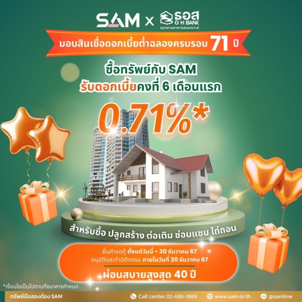 นอกจากนี้ ยังมีโปรโมชัน “SAM ทรัพย์มือสองต้องบอกต่อ” เพียงแนะนำทรัพย์ SAM ให้กับเพื่อนหรือคนรู้จัก รับค่าแนะนำสูงสุดถึง 3 ล้านบาทต่อ 1 รายการ และ SAM ยังร่วมกับธนาคารชั้นนำ ทั้งธนาคารกรุงเทพ ธนาคารยูโอบี ธนาคารทีเอ็มบีธนชาต (ttb) ธนาคารกสิกรไทย และธนาคารอาคารสงเคราะห์ (ธอส.) โดยล่าสุด ธอส. จัดโปรโมชันพิเศษสุดสำหรับลูกค้าที่ซื้อทรัพย์ SAM และยื่นขอสินเชื่อภายใน 30 ธันวาคมนี้ รับ “สินเชื่อบ้าน ดอกเบี้ยต่ำ ฉลองครบรอบ 71 ปี ธอส.” ด้วยอัตราดอกเบี้ยพิเศษคงที่ 6 เดือนแรก เพียง 0.71% ผ่อนได้นานสูงสุด 40 ปี เงื่อนไขเป็นไปตามที่ธนาคารกำหนด