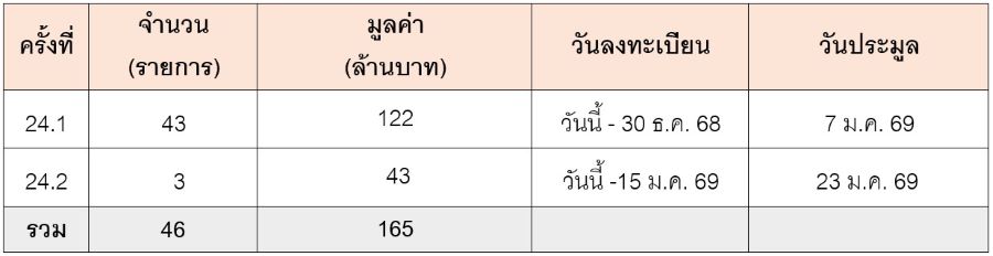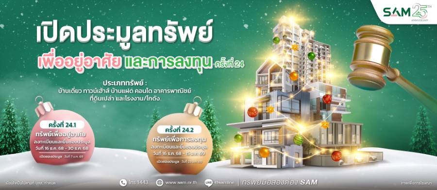 ทั้งนี้ ผู้สนใจเข้าร่วมประมูลสามารถลงทะเบียนและยื่นซองประมูล พร้อมเอกสารประกอบการประมูลที่กำหนด โดยทรัพย์เพื่อที่อยู่อาศัยและเพื่อการลงทุน ราคาไม่เกิน 20 ลบ. (ครั้งที่ 24.1/2568) ภายในวันที่ 30 ธ.ค. 2568 และกำหนดเปิดซองประมูลวันที่ 7 ม.ค. 2569 ส่วนทรัพย์ที่มีราคาสูงกว่า 20 ลบ. (ครั้งที่ 24.2/2568) ภายในวันที่ 15 ม.ค. 2569 และกำหนดเปิดซองประมูลวันที่ 23 ม.ค. 2569 เวลา 10.00 น. เป็นต้นไป ที่สำนักงานใหญ่ SAM อาคารซันทาวเวอร์ส ถ.วิภาวดีรังสิต กรุงเทพฯ
