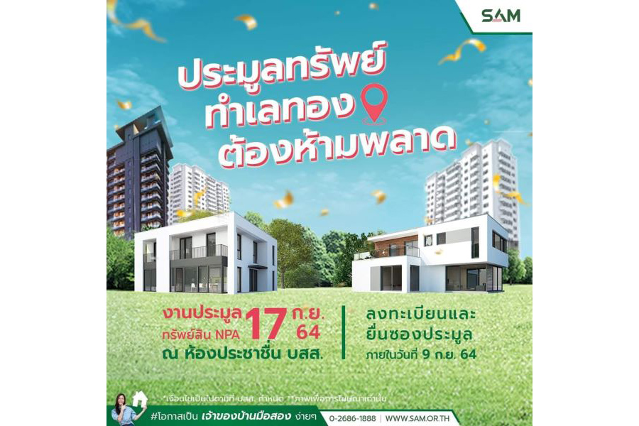 นายธรัฐพร เตชะกิจขจร กรรมการผู้จัดการ บริษัท บริหารสินทรัพย์สุขุมวิท จำกัด (บสส.) หรือ SAM เปิดเผยว่า SAM เตรียมจัดประมูลทรัพย์สินรอการขาย (NPA) ผ่านทางช่องทางออนไลน์ ฝ่าวิกฤตโควิด-19 ต่อเนื่องเป็นครั้งที่ 8 ของปี 2564 เพื่อเปิดโอกาสการลงทุนกระตุ้นเศรษฐกิจอีกรอบ ก่อนเริ่มไตรมาส 4 โดยทุกรอบที่ผ่านมา ได้รับความสนใจจากนักลงทุนทั้งรายใหญ่และรายย่อยเข้าร่วมยื่นซองจำนวนหลายรายการ โดยครั้งนี้ คัดทรัพย์เพื่อการลงทุนและทรัพย์เพื่อการอยู่อาศัย เช่น บ้านเดี่ยว ทาวน์เฮ้าส์ อาคารพาณิชย์ในทำเลดีมีศักยภาพทั่วประเทศ มูลค่ารวมทั้งสิ้นกว่า 100 ล้านบาท เข้าร่วมประมูล กำหนดจัดงานใน วันศุกร์ที่ 17 กันยายน 2564 ณ สำนักงานใหญ่ของ SAM อาคารซันทาวเวอร์ส บี ชั้น 24 ถ.วิภาวดีรังสิต ตัวอย่างทรัพย์เด่นที่น่าสนใจ อาทิ ที่ดินแปลงสวย เนื้อที่เกือบ 223 ไร่ โครงการ พัทยาคันทรี่คลับ แอนด์ รีสอร์ท ถ.ฉะเชิงเทรา-สัตหีบ ในอ.บางละมุง จ.ชลบุรี ตั้งอยู่ในย่านนิคมอุตสาหกรรมอมตะซิตี้ สนามกอล์ฟสยามคันทรีคลับพัทยาโอลด์คอร์ส และสนามกอล์ฟแหลมฉบัง ไม่ไกลจากแหล่งท่องเที่ยวและสถาบันการศึกษา ม.ธรรมศาสตร์ ศูนย์พัทยา ม.เอเชียน สนามแข่งรถพีระอินเตอร์เนชั่นแนล เซอร์กิต และหมวดการทางบางละมุง ราคาเริ่มต้น 271.79 ล้านบาท ที่ดินเปล่า เนื้อที่เกือบ 6 ไร่ ถ.พระรามที่ 2 อ.เมืองสมุทรสงคราม จ.สมุทรสงคราม ย่านองค์การบริหารส่วนตำบลบางแก้ว ดอนหอยหลอด รร.บ้านบางบ่อ ห้างบิ๊กซี ตลาดสมัชชาแม่กลอง ร้านเอสซีจี ร้านแดงอาหารทะเล และวัดเจริญสุนทรทราราม ราคาเริ่มต้น 8.09 ล้านบาท โรงงานอุตสาหกรรม 2 ชั้น เนื้อที่ 5 ไร่เศษ ในอ.สารภี จ.เชียงใหม่ การคมนาคมสะดวกสบาย ทำเลแห่งศักยภาพ มีแนวสายส่งไฟฟ้าแรงสูง อยู่บริเวณ ถ.สายเลี่ยงเมืองเชียงใหม่รอบนอก ราคาเริ่มต้น 51.66 ล้านบาท ที่ดินเปล่า เนื้อที่ 2 ไร่เศษ โครงการ โคกฟันโปง ถ.ศรีจันทร์ (สายเก่า) อ.เมืองขอนแก่น จ.ขอนแก่น ทำเลดี ไม่ไกลจากตัวเมือง สนามบิน และ ถ.เลี่ยงเมือง ราคาเริ่มต้น 4.94 ล้านบาท ส่วนทรัพย์ลงทุนน่าสนใจในกรุงเทพฯ มีตึกแถว 3 ชั้น 2 คูหา เนื้อที่ 32 ตร.ว. ถ.สุขุมวิท 101 เขตพระโขนง ใกล้สถานีรถไฟฟ้าปุณณวิถี ทรูดิจิตัลปาร์ค ห้างแม็คโคร ราคาเริ่มต้น 6.89 ล้านบาท เป็นต้น