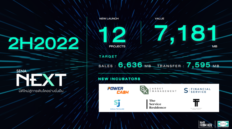 สำหรับเสนา ในปี 2565 เป็นปีแห่งการทรานส์ฟอร์มครั้งใหญ่ สร้างการเปลี่ยนแปลงในการดำเนินธุรกิจครั้งสำคัญภายใต้กลยุทธ์ “SENA Next” มิติใหม่สู่การเติบโตอย่างยั่งยืน เพื่อให้บรรลุเป้าหมายและการเติบโตอย่างแข็งแกร่ง พร้อมตอกย้ำแนวคิด “Made From Her” คิดละเอียดกว่า ก็อยู่สบายกว่า โดยในด้านของการเปิดตัวโครงการอสังหาริมทรัพย์ ช่วงครึ่งปีแรกได้มีการเปิดตัวโครงการใหม่ 6 โครงการ มูลค่ารวม 4,845 ล้านบาท แบ่งเป็นโครงการแนวราบ 1 โครงการ แนวสูง 5 โครงการ ซึ่งสร้างยอดขายแล้ว 5,480 ล้านบาท สำหรับครึ่งปีหลัง ตามแผนจะมีการเปิดโครงการใหม่เพิ่มอีก 12 โครงการ มูลค่ารวม 7,181 ล้านบาท แบ่งเป็นโครงการแนวราบ 5 โครงการ และแนวสูง 7 โครงการ ซึ่งแนวราบจะเปิดตัวทุกแบรนด์ เช่น เสนา วิลล์, เสนา พาร์ค วิลล์, เสนา วีว่า และเสนา เวล่า และแนวสูงไฟติ้งค์แบรนด์ เสนาคิทท์ และ เฟล็กซี่ ซึ่งในจำนวน 12 โครงการใหม่ที่จะเปิดตัวในช่วงครึ่งปีหลัง เป็นโครงการร่วมทุนกับพันธมิตรธุรกิจ “ฮันคิว ฮันชิน พร็อพเพอร์ตี้ส์ คอร์ป” 7 โครงการ คิดเป็นมูลค่ากว่า 4,067 ล้านบาท