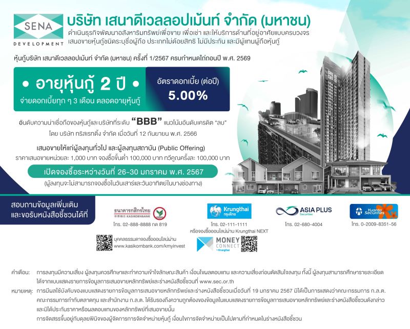 บริษัท เสนาดีเวลลอปเม้นท์ จำกัด (มหาชน) หรือ SENA พร้อมเสนอขายหุ้นกู้ชุดใหม่ โดยเป็นหุ้นกู้ชนิดระบุชื่อผู้ถือ ประเภทไม่ด้อยสิทธิ ไม่มีประกัน และมีผู้แทนผู้ถือหุ้นกู้ ให้แก่ผู้ลงทุนทั่วไปและผู้ลงทุนสถาบัน มูลค่าเสนอขายทั้งสิ้นไม่เกิน 1,000 ล้านบาท อายุหุ้นกู้ 2 ปี อัตราดอกเบี้ยคงที่ 5% ต่อปี ชำระดอกเบี้ยทุกๆ 3 เดือน ตลอดอายุหุ้นกู้ สำหรับอันดับความน่าเชื่อถือของบริษัทและหุ้นกู้อยู่ที่ระดับ “BBB” แนวโน้ม “ลบ” จากบริษัท ทริสเรทติ้ง จำกัด เมื่อวันที่ 12 กันยายน 2566 ซึ่งหุ้นกู้ชุดนี้จะเปิดให้จองซื้อระหว่างวันที่ 26-30 มกราคม 2567 นี้ ผ่านธนาคารกรุงไทย จำกัด (มหาชน)  ธนาคารกสิกรไทย จำกัด (มหาชน) บริษัทหลักทรัพย์เอเซีย พลัส จำกัด และบริษัทหลักทรัพย์ หยวนต้า (ประเทศไทย) จำกัด โดยจองซื้อขั้นต่ำ 100,000 บาท และทวีคูณครั้งละ 100,000 บาท ทั้งนี้ การจองซื้อหุ้นกู้ในช่วงวันเสาร์และวันอาทิตย์สามรถจองซื้อได้ผ่านผู้จัดการการจัดจำหน่ายหุ้นกู้บางรายและในบางช่องทางเท่านั้น