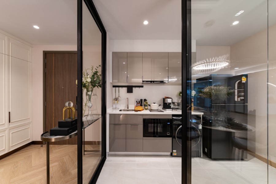 ห้องพักอาศัยทุกยูนิตได้รับการออกแบบอย่างพิถีพิถันในทุกรายละเอียด โปร่งโล่งด้วยเพดานสูง 2.8 ม. รองรับการตกแต่งหลากหลายสไตล์ พร้อมติดตั้งสิ่งอำนวยความสะดวกภายในระดับพรีเมียม ตอบโจทย์การอยู่อาศัยอย่างครบครัน ทั้งระบบ Digital Door Lock ชุดครัว Built-in พร้อม Hob & Hood และ Built-in Microwave เครื่องปรับอากาศแบบ Cassette Type ที่มาพร้อมระบบกรองฝุ่นละเอียด PM1.0 รวมถึงห้องน้ำที่ตกแต่งด้วยโถสุขภัณฑ์อัตโนมัติแบบ Full Function ฝักบัว Hand Shower และ Rain Shower พร้อมฉากกั้นอาบน้ำกระจกนิรภัย (Tempered Glass)