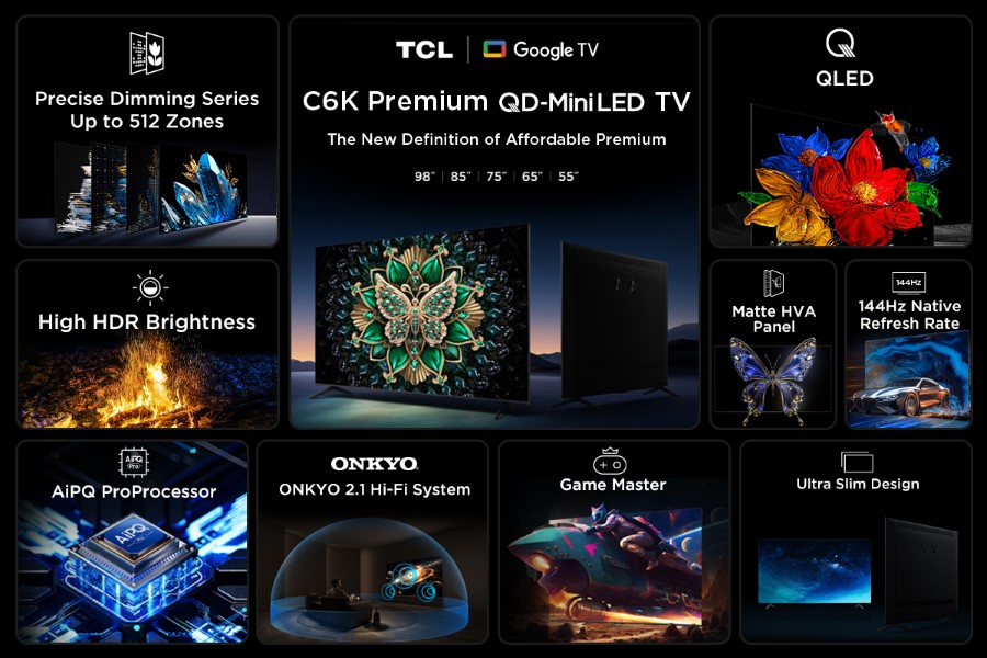 TCL ส่ง C6K หนึ่งในไลน์อัป  C Series เดินเกมรุกตลาดทีวีพรีเมียม ชูเทคโนโลยี QD-Mini LED สุดล้ำ ขนาดหน้าจอ 55 – 98 นิ้ว ให้ภาพสีสมจริง คมชัดทุกมุมมอง หน้าจอแบบ HVA Panel ให้คอนทราสต์ที่สูงมาก สีสันสดใส และมุมมองภาพที่ดีขึ้น ยกระดับคุณภาพทั้งภาพและเสียง ด้วยฟีเจอร์  ขั้นสูง All-domain Halo Control ควบคุมรายละเอียดสูงสุด 512 โซน ระบบเสียง ONKYO 2.1 Hi-Fi และชิป AI อัจฉริยะ AiPQ Pro Processor ปรับแต่งภาพอัจฉริยะ เพื่อการรับชมอย่างสมบูรณ์แบบที่พัฒนาโดย TCL มอบประสบการณ์ความบันเทิงเต็มอิ่มทุกอารมณ์ คมชัดทุกฉาก ลึกทุกมิติ ดีไซน์ “Minimal Elegance” ลง EISA ตัวกับทุกไลฟ์สไตล์ในบ้าน ยืนยันคุณภาพด้วยรางวัล “GAMING TV 2025-2026” ทีวีสำหรับคอเกม ตอบโจทย์สายบันเทิง สายเกม และผู้บริโภคยุคใหม่