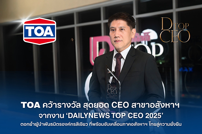 เมื่อวันที่ 19 กันยายน 2568 บริษัท ทีโอเอ เพ้นท์ (ประเทศไทย) จำกัด (มหาชน) หรือ TOA ประกาศความสำเร็จอีกครั้ง โดย คุณจตุภัทร์ ตั้งคารวคุณ ประธานเจ้าหน้าที่บริหาร รับรางวัลเกียรติยศ สุดยอดผู้นำองค์กรในสาขาธุรกิจอสังหาริมทรัพย์ จากงาน ‘DAILYNEWS TOP CEO 2025’ จัดโดยเดลินิวส์ เพื่อยกย่องเชิดชูเกียรติให้กับผู้บริหารสูงสุดขององค์กรทั้งภาครัฐและเอกชน ที่มีความโดดเด่นในการบริหารจัดการด้านต่าง ๆ จนประสบความสำเร็จ ส่งผลให้เกิดประโยชน์ต่อภาพรวมทางเศรษฐกิจ สังคม และประเทศชาติ สะท้อนบทบาทสำคัญของ TOA ในฐานะผู้นำอุตสาหกรรมสี – เคมีภัณฑ์ก่อสร้าง และการเป็นพันธมิตรองค์กรสีเขียว ‘Green Partner’ ของภาคอสังหาฯ ไทย เพื่อเดินหน้าสู่ความยั่งยืน โดยมี คุณประพิณ รุจิรวงศ์, คุณสิริวรรณ พันธุ์ปรีชากิจ กรรมการบริหารเดลินิวส์ พร้อมด้วย คุณนต รุจิรวงศ์, คุณนนท์ รุจิรวงศ์ และ คุณนลิน รุจิรวงศ์ รองกรรมการผู้จัดการใหญ่ ฝ่ายกลยุทธ์องค์กรและการตลาด (EVP) ร่วมแสดงความยินดี ณ โรงแรมเซ็นทารา แกรนด์ แอท เซ็นทรัลเวิลด์