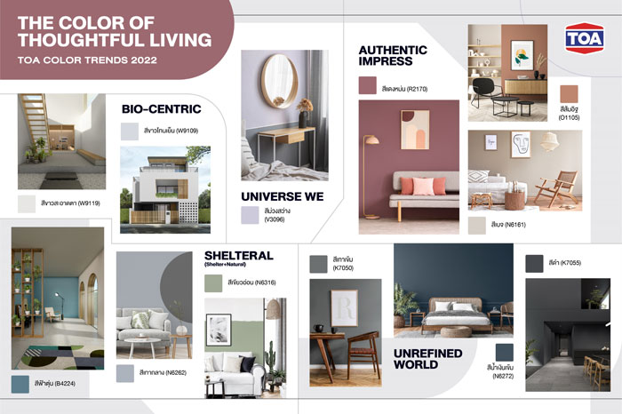 โดยผู้เชี่ยวชาญของทีโอเอ ได้นำแนวคิดดังกล่าวจากเหล่าสถาปนิกมาวิเคราะห์ จนออกมาเป็น Trendscope 5 กลุ่มเทรนด์สีใหม่ได้อย่างลงตัว (TOA COLOR TRENDS 2022) ประกอบด้วย 1. กลุ่มสีขาวสะอาดตา หรือ BIO-CENTRIC (เฉดสี W9119, W9109)