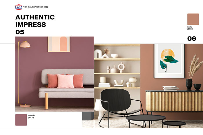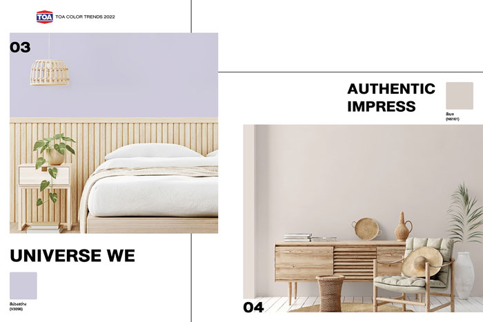 ในแนวคิด Hygienic Design เน้นความปลอดโปร่ง และการยกระดับสุขภาวะทางกายและใจที่ดี ที่คำนึงถึงความยั่งยืนของธรรมชาติและสิ่งแวดล้อม 2. กลุ่มสีม่วงสว่าง หรือ UNIVERSE WE (เฉดสี V3096) สะท้อนถึงความเป็นหนึ่งเดียวไม่แบ่งแยก หรือเป็นสีของทุกสรรพสิ่งบนโลก 3. กลุ่มสีเบจ แดงหม่น ส้มอิฐ หรือ AUTHENTIC IMPRESS (เฉดสี N6161, R2170, O1105) กลุ่มสีที่เป็นแทนของการให้ความสำคัญถึงวัฒนธรรมและขนบธรรมเนียม โดยสะท้อนให้เห็นถึงการผสมผสานความเก่าและใหม่ 4. กลุ่มสีฟ้าตุ่น เทากลาง และเขียวอ่อน หรือ SHELTERAL (เฉดสี B4224, N6262, N6316) ให้ความรู้สึกสงบและสบายใจแล้ว ช่วยลดทอนความตึงเครียดและเพิ่มความผ่อนคลาย 5. กลุ่มสีเทาเข้ม นํ้าเงินเข้ม และสีดำ หรือ UNREFINED WORLD (เฉดสี K7050, N6272, K7055) กลุ่มสีที่แสดงถึงความเรียบเท่สไตล์โมเดิร์น สะท้อนความรู้สึกถึงสัจจะแท้จริงของโลกในปัจจุบัน ผ่านการตีความความงามของโลกที่ไม่สมบูรณ์แบบ ความดิบ และความขรุขระของสัจจะวัสดุ เชิดชูความเป็นเอกลักษณ์ และความแตกต่างที่สามารถอยู่ร่วมกันได้อย่างมีความหมาย